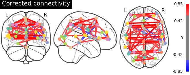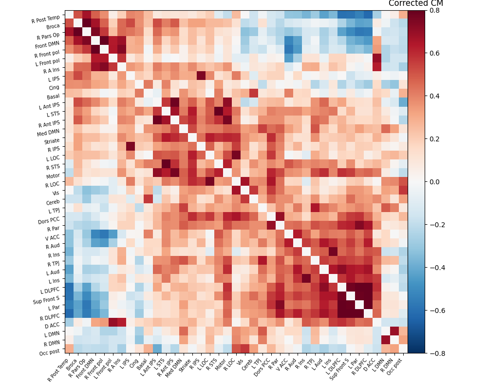 The connectivity matrix represents the strength of functional connections between different regions of the brain. To quantify these connections, a Pearson correlation is calculated between the time series of different regions in the matrix. The resulting correlation values are encoded using a color bar to visualize the connectivity patterns. Finally, the process of brain masking and retrieving connectivity data was accomplished for a single subject using the nilearn library[7].