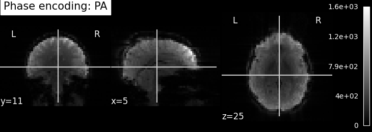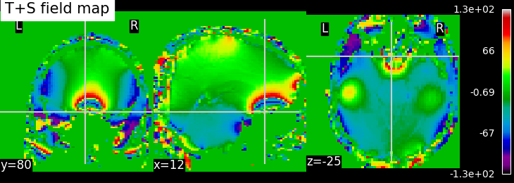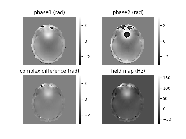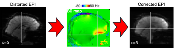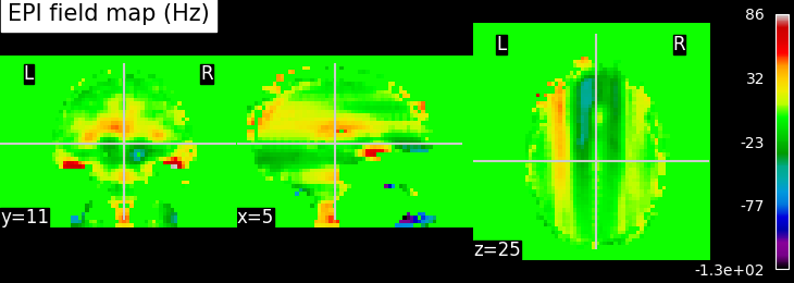 EPI images can be utilized to approximate a field map by acquiring two volumes with opposite phase encoding directions. The difference in distortion between these two acquisitions is then utilized in a least squares algorithm to estimate the field map. Although the resulting field map may exhibit some artifacts, as demonstrated in the following images, it is still sufficient to correct for distortion to some extent.