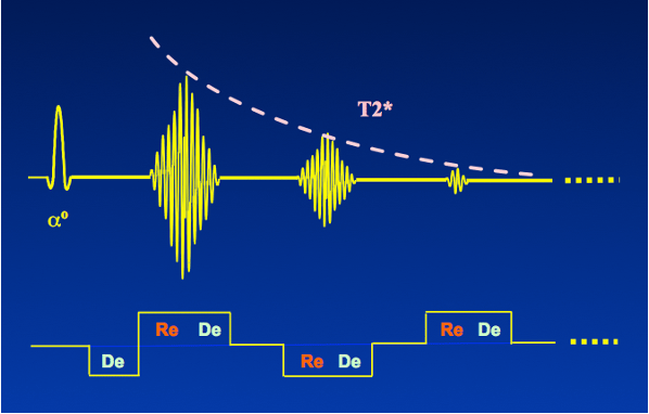 As a result, the reconstructed phase map from the complex MRI signal contains information about the B0 field variation. However, due to the involvement of various sources in phase variations, the phase maps can only provide an approximation of the ΔB0 field. Most of these sources do not change with different echo times, except for the phase induced by B0 inhomogeneity, which scales with the echo time. Therefore, to obtain a ΔB0 field map, at least two phase maps with different echo times need to be acquired. While MRI-based B0 mapping can be performed using any MRI pulse sequence, the fast gradient-echo (GRE) method is commonly used due to its speed, ease of use, and inherent sensitivity to B0 offsets. The pulse sequence diagram for GRE is as follows: