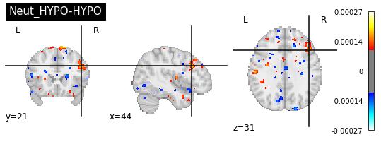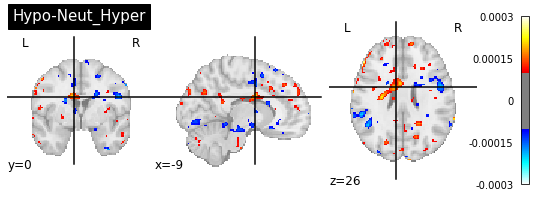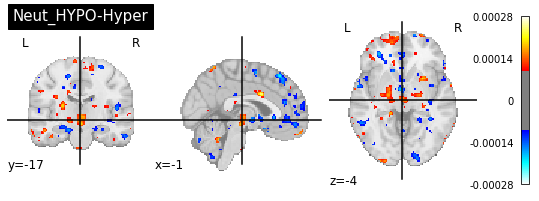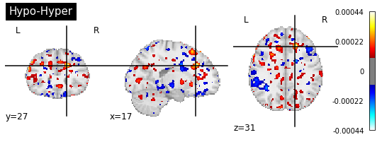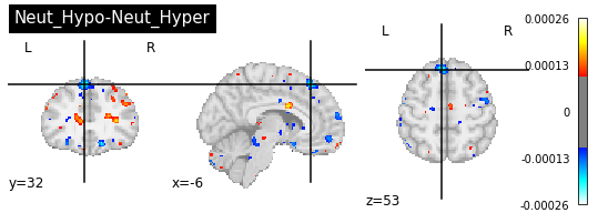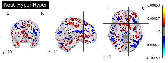 masker.inverse_transform(). Since there were four classes, six different class comparisons can be made and the highest coefficient for each comparison are presented in the plots below. The highest peaks represents the brain regions that either when activated or deactivated (red or blue) had the highest preictive value of the class(type of suggestion). For example, when looking at the first plot, the activation of the dlPFC appears to be the most predictive to predict the Neut_HYPO vs HYPO class.