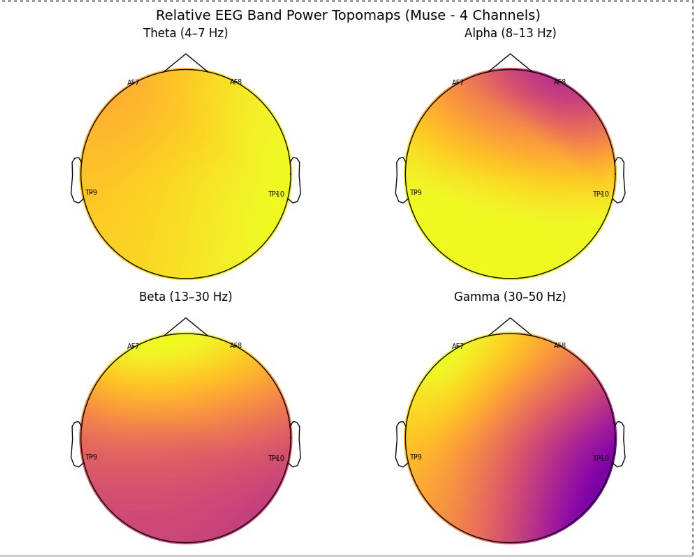 EEG Topographical Maps Topographic visualizations of average relative EEG power for each frequency band (from Muse headset – 4 channels) reveal distinct spatial patterns: Alpha activity is more prominent over posterior regions, consistent with literature linking it to relaxed focus and motor readiness. Gamma activity showed asymmetric right-side prominence. Beta and Theta distributions were more uniformly diffuse, with Beta slightly higher at posterior sites.