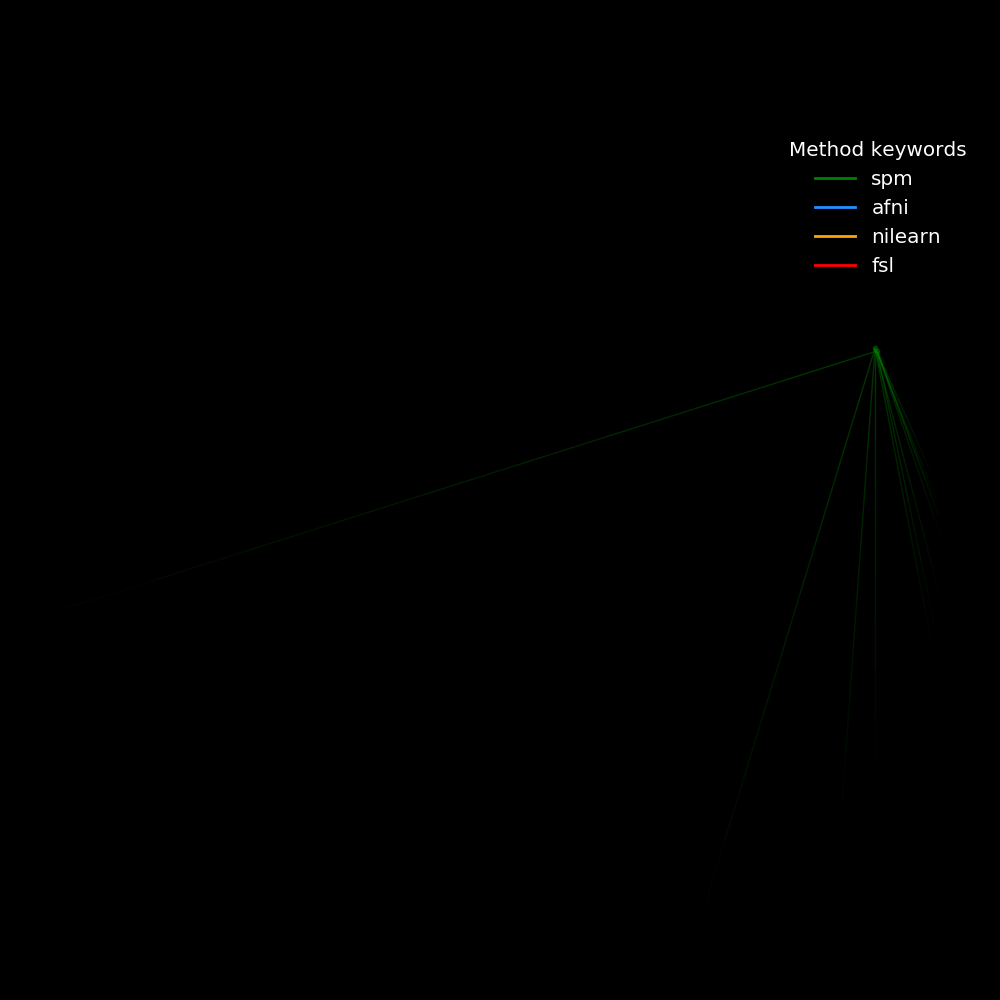 The purpose of this project was to make a Python package that could create a citation network for a given field, colored by methods used by papers in that field. Such a figure would be created for each year in a range, so that one can see the development of the network and the use of methods over time. Using this package to look at research using fMRI, I hope to observe whether methods correspond to groupings of papers in the citation network.
