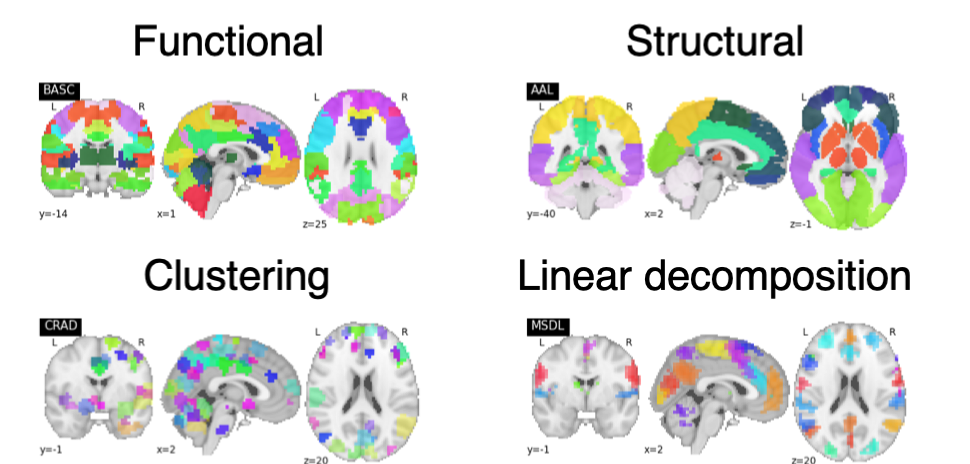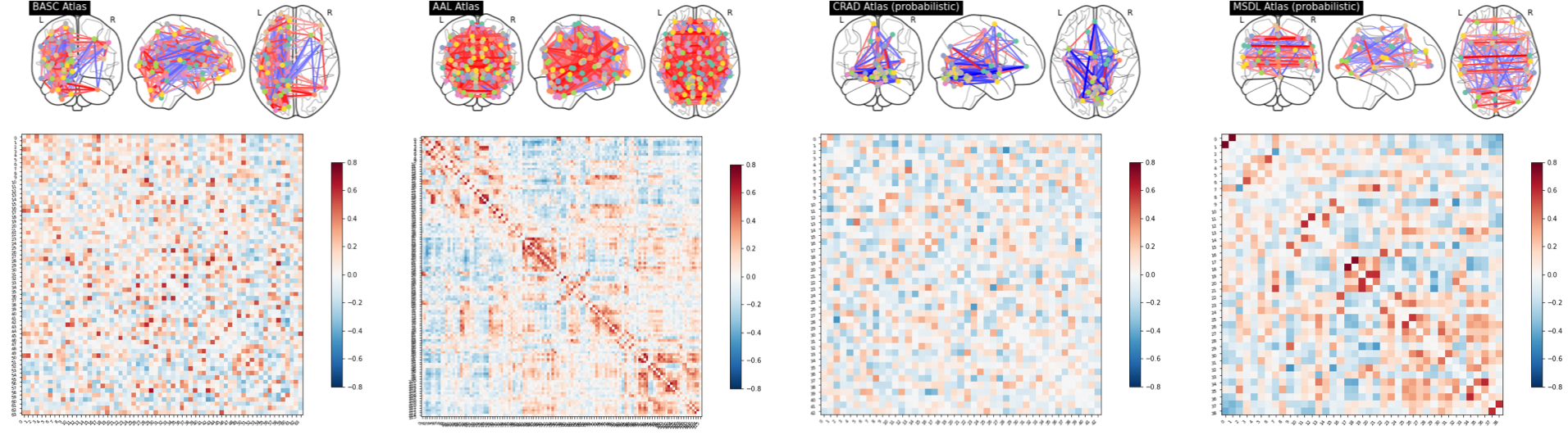 Four different atlases will be used: functional (BASC multiscale)2,3, structural (AAL)4, clustering method (Craddock)5, and linear decomposition (MSDL)6.